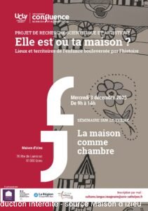 « Elle est où ta maison? » Projet de recherche scientifique et artistique La maison comme chambre Mercredi 3 décembre 2025 de 9h00 à 16h00 Maison d’Izieu La photographie est au cœur de cette séance se déroulant à la Maison d’Izieu. En préambule, Marie Pellegrini présentera des clichés sortis des archives de la Maison d’Izieu. La suite de la journée sera consacrée à un atelier animé par Johanna Quillet. Propos de la séance La photographie remplit le vide laissé par les absents. Sorties des archives de la Maison d’Izieu, les photographies présentées témoignent de la vie à colonie, apparaissant ici comme source historique. Avec Johanna Quillet, nous verrons comment la photographie est utilisée pour faire mémoire : « la journée de séminaire à Izieu interroge la mémoire du dedans et la façon d’habiter la maison d’Izieu, lieu de refuge de l’intime, de l’innocence et de l’enfance, et qui a vu ses rires sauvés puis raflés et déportés. À travers l’utilisation du sténopé, entre traces et silence, visible et invisible, la rencontre ouvre le champ de l’image photographique de la mémoire du lieu, porté par l’immensité du paysage du Bugey qui l’enserre comme un écrin. » Les intervenants de la séance du 3 décembre 2025 Marie Pellegrini, responsable Recherche, Archives et Documentation à la Maison d’Izieu Johanna Quillet, photographe plasticienne Seront également présents : Christine Bouvier-Müh, enseignante-chercheuse en philosophie, UR CONFLUENCE, UCLy, psychanalyste membre de l’A.L.I. Alexandre Nugues-Bourchat, directeur de la Maison d’Izieu Programme 9h : Accueil café 9h30 – 10h30 : Présentation de photographies d’archives de la colonie par Marie Pellegrini, responsable Recherche, Archives et Documentation 10h30 – 12h30 : Atelier artistique avec Johanna Quillet, photographe plasticienne (https://johannaquillet.com) Pause déjeuner : Chacun apporte son repas. Pour ceux, celles qui le souhaitent, nous vous proposons d’apporter votre spécialité, sucrée ou salée, afin de la partager ! 14h – 16h : Reprise de l’atelier Informations pratiques Lieu : Maison d’Izieu 70 route de Lambraz 01300 IZIEU Pour suivre cette journée, inscription préalable auprès de cultures.langue.imaginaire@univ-catholyon.fr Un bus est également proposé aux participants : Aller : départ 7h30 de l’UCLy – Retour : départ 16h15 de la Maison d’Izieu Limité à 40 personnes télécharger le programme « Elle est où ta maison? Lieux et territoires de l’enfance bouleversée par l’histoire » « Elle est où ta maison ? » est la thématique du séminaire de recherche organisé par l’unité de recherche CONFLUENCE, Sciences et Humanités, de l’UCLy et la Maison d’Izieu. Il fait suite au colloque d’octobre 2023 intitulé « L’enfance, la maison ; lieux et territoires de l’enfance quand la guerre détruit » qui avait lancé de nombreuses et prometteuses pistes de réflexion. Ce projet pluridisciplinaire se déploiera sur trois ans et s’achèvera en 2027 par un colloque international. Des artistes se sont associés aux chercheurs afin d’aboutir à une exposition. À destination de la communauté scientifique, des étudiants et des professeurs, huit séances se dérouleront au cours de l’année 2024-2025, à l’UCLy ou à Izieu. Résumé du projet La maison, en tant que territoire privilégié de l’enfance constitue traditionnellement pour le sujet un espace de protection contre les agressions du monde extérieur, nécessaire à l’enfant comme à l’adulte pour grandir en humanité, cheminer dans l’existence. Quelle que soit sa configuration, la maison constitue pour l’enfant un espace porteur des traces et de la mémoire de ce qui en ses murs est vécu, reçu positivement ou négativement, rejeté, mémorisé, transformé ou pas. Par-delà toute spécificité d’ordre domestique, cet espace est susceptible de faire lieu et lien dans la mesure où la maison, quelle que soit sa configuration (roulotte, cabane ou logement urbain…) réfère pour chacun aux marqueurs de l’enfance et de ses territoires ? En savoir plus sur les séances précédentes Projet soutenu par La Région Auvergne-Rhône-Alpes