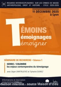 Séminaire de recherche LADEC – Maison d’Izieu Regards interdisciplinaires sur les crimes de masse – Anthropologie, Droit et Histoire « Témoins, témoignages, témoigner » – Séance n°1 Jeudi 11 décembre, de 9h à 16h30 à Lyon ou en webinaire Le LADEC de l’Université Lyon 2 et la Maison d’Izieu débute le cycle 2 du séminaire de recherche. Les crimes de masse sont désormais abordés sous l’angle « témoins, témoignages, témoigner », toujours en croisant les regards des différentes disciplines – Anthropologie, Droit et Histoire. Pour cette première séance, nous retrouvons Tiphaine Duriez et Dejan Dimitrijevic qui aborderont les enjeux contemporains du témoignage à travers l’exposition des cas de la Serbie et de la Colombie. Propos de la séance Comment la violence de masse et les massacres, en tant que pratiques ritualisées et dispositifs de pouvoir, participent-ils à la reconfiguration des ordres politiques et symboliques dans les processus de transition ou de subversion politique? La journée proposera une approche anthropologique des logiques sacrificielles, des mémoire(s) traumatiques et des récits de légitimation, et un dialogue entre les processus politiques contemporains de la Serbie et de la Colombie. Plusieurs entrées analytiques seront empruntées : Mémoire et narration : Comment les récits post violence (par les bourreaux, les victimes et les tiers) reconstruisent-ils le sens politique des massacres ? Rôle des corps violentés comme « marqueurs territoriaux » ou « preuves historiques » (ex : charniers comme symboles de pouvoir). Violence et liminalité politique : Analyse des périodes de transition où la violence devient un moyen de « désincorporer » l’ancien ordre et d’« incorporer » le nouveau. Étude des acteurs « liminaux » (milices, bourreaux improvisés) et leur rôle dans la reconfiguration des hiérarchies dans le nouvel ordre social. Resymbolisation post-violence : Comment les objets, lieux ou dates des massacres sont-ils réinvestis pour fonder une nouvelle légitimité ? Rôle des commémorations et des mémoriaux dans l’ancrage d’un nouveau récit national. Intervenants Dejan Dimitrijevic, professeur des universités en anthropologie Tiphaine Duriez, maîtresse de conférence à l’Université Lyon II/LADEC Avec la participation de : Alexandre Nugues Bourchat, directeur de la Maison d’Izieu Informations pratiques Pour participer à cette séance, deux possibilités : En présentiel à Lyon Amphithéâtre Fugier campus Berges du Rhône – Rue Chevreul – Bâtiment Athéna (ATH.038) – 69007 LYON https://www.univ-lyon2.fr/universite/lieux-sites-campus/amphitheatre-fugier Pour assister à la journée, vous devez réserver votre billet en ligne. Réserver son billet En webinaire Les interventions seront retransmises en direct en webinaire. Si vous souhaitez le suivre, il vous suffit d’en faire la demande : page d’inscription. S’INSCRIRE À LA VISIO Vous pouvez accéder au replay des précédentes séances sur la page dédiée au séminaire de recherche : Regards interdisciplinaires sur les crimes de masse Le projet global « Regards interdisciplinaires sur les crimes de masse – Anthropologie, Droit et Histoire » Massacre, crime de guerre, crime contre l’humanité, génocide… autant de termes qui sont devenus objets du droit après la Seconde Guerre mondiale. La césure historique qu’a constitué cet événement est notamment signifiée par deux rejets fondamentaux : 1) la disqualification définitive de la raciologie et du classement hiérarchique des groupes humains, 2) la condamnation universelle de l’entreprise coloniale. Ces nouveaux objets du droit ont principalement été formés sur la base des décisions judiciaires des procès des crimes de masse commis par l’Allemagne nazie. Ces instructions créent un nouveau cadre juridique, qui se donne pour ambition d’ouvrir une ère où l’élaboration de différentes convention et traités sont sensés contribuer à la domestication et à la maîtrise de la violence pour qu’elle ne devienne pas extrême. Néanmoins les grandes puissances se sont souvent abstenues de les ratifier afin de ne pas en subir les conséquences. Depuis lors, les définitions données à ces qualifications juridiques sont en constante évolution. Les conflits et rapports de force contemporains nécessitent d’être pris en compte. Ces situations nouvelles impactent non seulement la perception des violences contemporaines mais elles contribuent aussi à reconsidérer celles du passé, remodelant ainsi les catégories. Certaines violences jugées désormais « extrêmes » sont mises hors la loi et comme telles, durement sanctionnables. Qu’est-ce que le LADEC ? Le LADEC est la seule Unité de Recherche en anthropologie en Auvergne-Rhône-Alpes. Les recherches s’organisent autour de 2 pôles : « Mondes défaits/Mondes refaits » qui traite des situations de violences, de menaces et de transition incertaines, mais également aux processus de reconstruction, de production de savoirs et d’utopies. « Natures incertaines, frontières du vivant » qui étudie les rapports des humains à leur environnement ou à la santé. Ce séminaire s’inscrit dans les recherches du premier pôle. Il est né d’interrogations et problématiques issues des échanges entre le LADEC et la Maison d’Izieu.