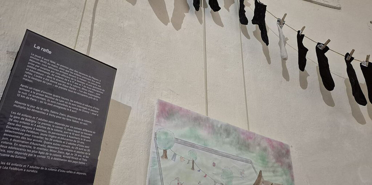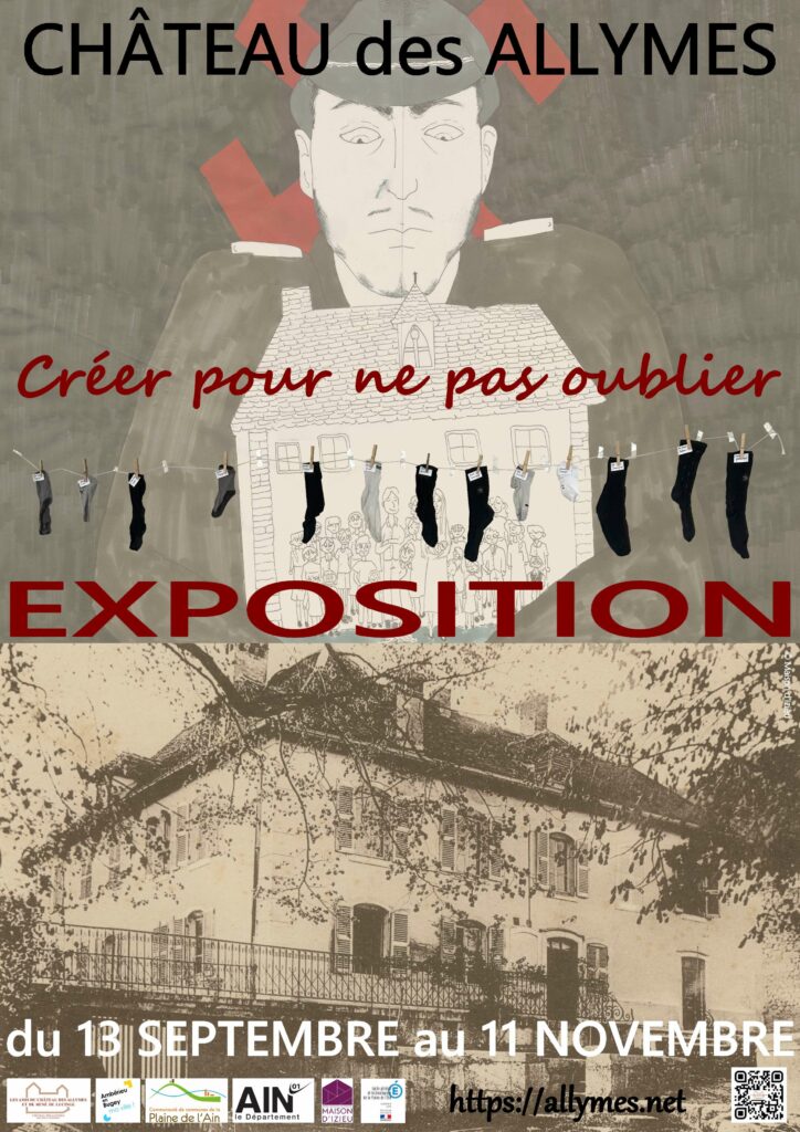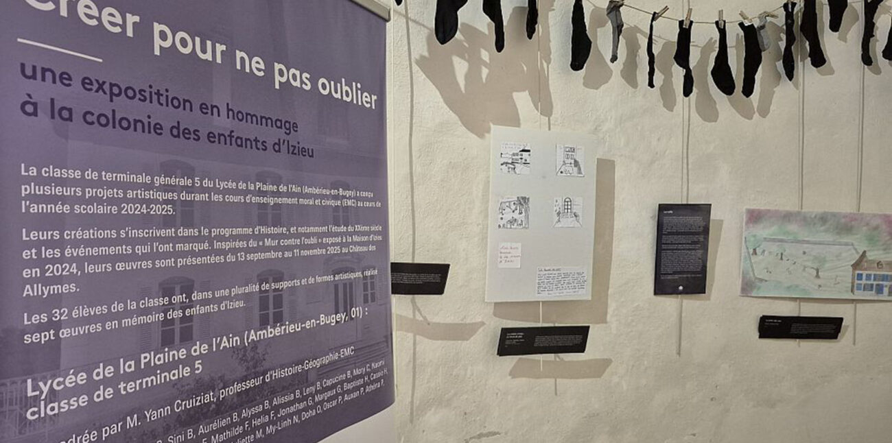 Exposition temporaire au Château des Allymes Créer pour ne pas oublier Du 13 septembre au 11 novembre, découvrez au Château des Allymes l’exposition temporaire « Créer pour ne pas oublier ». Celle-ci reprend une partie du « Mur contre l’Oubli », projet Rememchild exposé à la Maison d’Izieu en 2024. « Créer pour ne pas oublier » est une exposition en hommage à la colonie des enfants d’Izieu. Elle est accueillie par l’Association du Château des Allymes et de René de Lucinge du 13 septembre au 11 novembre 2025. Cette exposition est composée de 17 toiles en hommage à la colonie des enfants d’Izieu inspirée du “Mur Contre l’Oubli” exposé en 2024 au musée-mémorial et sept œuvres artistiques conçues et réalisées dans une pluralité de supports par les 32 élèves de la classe de Terminale Générale 5 du Lycée de la Plaine de l’Ain d’Ambérieu-en-Bugey, encadrés par Yann Cruiziat, professeur d’Histoire-Géographie-EMC. En savoir plus sur le site du Château des Allymes (c) Château des Allymes – Patrick Charignon 01 / 08 Partagez sur vos réseaux :