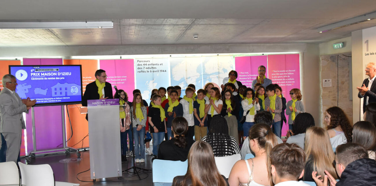 Prix Maison d’Izieu : Cérémonie Mardi 28 mai, 75 élèves, de la primaire au lycée professionnel, se rendaient à la Maison d’Izieu pour la cérémonie de remise des récompenses du Prix Maison d’Izieu. Ils se savaient lauréats du concours national depuis le 4 avril. L’annonce avait été faite en direct sur la chaîne Youtube de la Maison d’Izieu durant les Journées de la Mémoire. Ils ont reçu leur prix ce mardi 28 mai et découvert lequel d’entre eux avait été élu « Coup de cœur du public » Lauréat de la catégorie Primaire : École Notre Dame, Beauvais (60) Lauréat de la catégorie Collège : Collège Victor Duruy, Châlons en Champagne (51) Lauréat de la catégorie Enseignement professionnel : Lycée pro Fernand Forest, Saint-Priest (69) L’édition 2023-2024 Cette 5ème édition du Prix Maison d’Izieu fut plébiscitée : 36 classes dans 16 académies se sont inscrites pour participer au concours national. Les élèves devaient créer une capsule vidéo sur la thématique « lettres et dessins d’enfants réfugiés dans les conflits d’hier et d’aujourd’hui ». Au fil des années, les vidéos reçues sont de plus en plus qualitatives, rendant parfois aux jurys la tâche compliquée de départager de belles créations. La cérémonie Dominique Vidaud, directeur de la Maison d’Izieu, était le maître de cérémonie. Plusieurs personnalités, notamment du monde de l’Éducation, ont pris la parole et remis les trophées aux lauréats : • Mme Girardeau, directrice artistique et commissaire de l’exposition Déflagrations • M. Massat, Conseiller Pédagogique départemental Arts Visuels, membre du jury, représentant Mme Remer, Inspectrice et DSDEN de l’Ain • Mme Guillot-Patrique, Inspectrice Lettres et Histoire de l’Académie de Lyon, membre du jury • M. Montez, Inspecteur d’Histoire Géographie et Référent Mémoire et Citoyenneté de l’Académie de Lyon, membre du jury Tous ont insisté sur la nécessité de continuer ce travail de construction de la mémoire. Ils ont félicité l’engagement et l’investissement des professeurs et des élèves. Ils ont également applaudi la qualité de l’organisation de la Maison d’Izieu. Le coup de cœur du public C’est la récompense que la Maison d’Izieu décerne seulement le jour de la cérémonie. Tous les élèves espéraient recevoir ce trophée supplémentaire. Et ce sont les primaires de l’École Notre Dame de Beauvais qui ont littéralement sauté de joie à l’annonce du résultat. Après la cérémonie, tous ont pu se réunir autour d’un goûter, en partie financé par la boutique Brioches Pasquier de Charancieu / Les Abrets qui a offert des brioches Pitch pour l’occasion. revoir les vidéos des lauréats 01 / 15 Partagez sur vos réseaux :